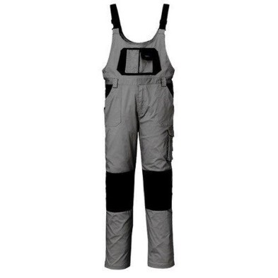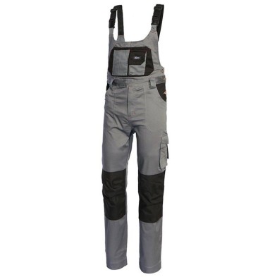 Peto Industrial Starter Stretch 8735 con tirantes elásticos regulables, múltiples bolsillos, bolsillo porta móvil con tejido e-care y porta metro en el pecho. Cintura elástica, rodillas reforzadas con tejido impermeable y apartados para rodilleras. Confeccionado en 97% algodón y 3% spandex, gramaje 265 g/m². Disponible en gris/negro y tallas S a 3XL.